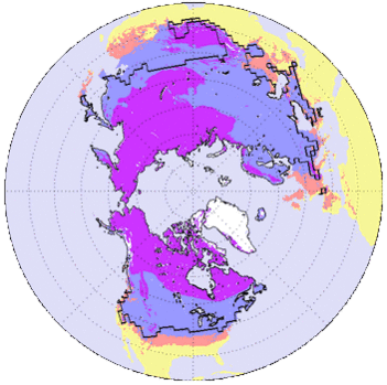 Прерывистая вечная мерзлота крайне уязвима к таянию. На Северо-Западе Канады к 2003 году протяжённость вечной мерзлоты сократилась примерно на 10—50 % за последние 50—60 лет. В Альберте и южных Северо-Западных территориях южная граница распространения вечной мерзлоты сместилась на север примерно на 120 километров за период с 1995 по 2021 годы. Кроме того, увеличение числа и площади лесных пожаров в Северном полушарии ускоряет темпы таяния вечной мерзлоты[26][27].