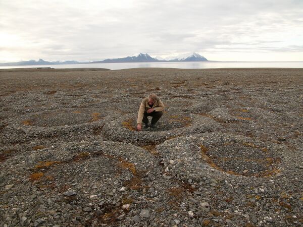Вечная мерзлота существенно влияет на рельеф местности, поскольку вода и лёд обладают разной плотностью, что приводит к деформациям при замерзании и оттаивании пород. Процессы вечной мерзлоты, такие как тепловое сжатие, образующее трещины и ледяные клинья, а также солифлюкция (постепенное движение почвы вниз по склону из-за многократного замерзания и оттаивания), часто создают наземные полигоны, кольца, ступени и другие узорчатые формы почвы в арктических, перигляциальных и альпийских районах[55].