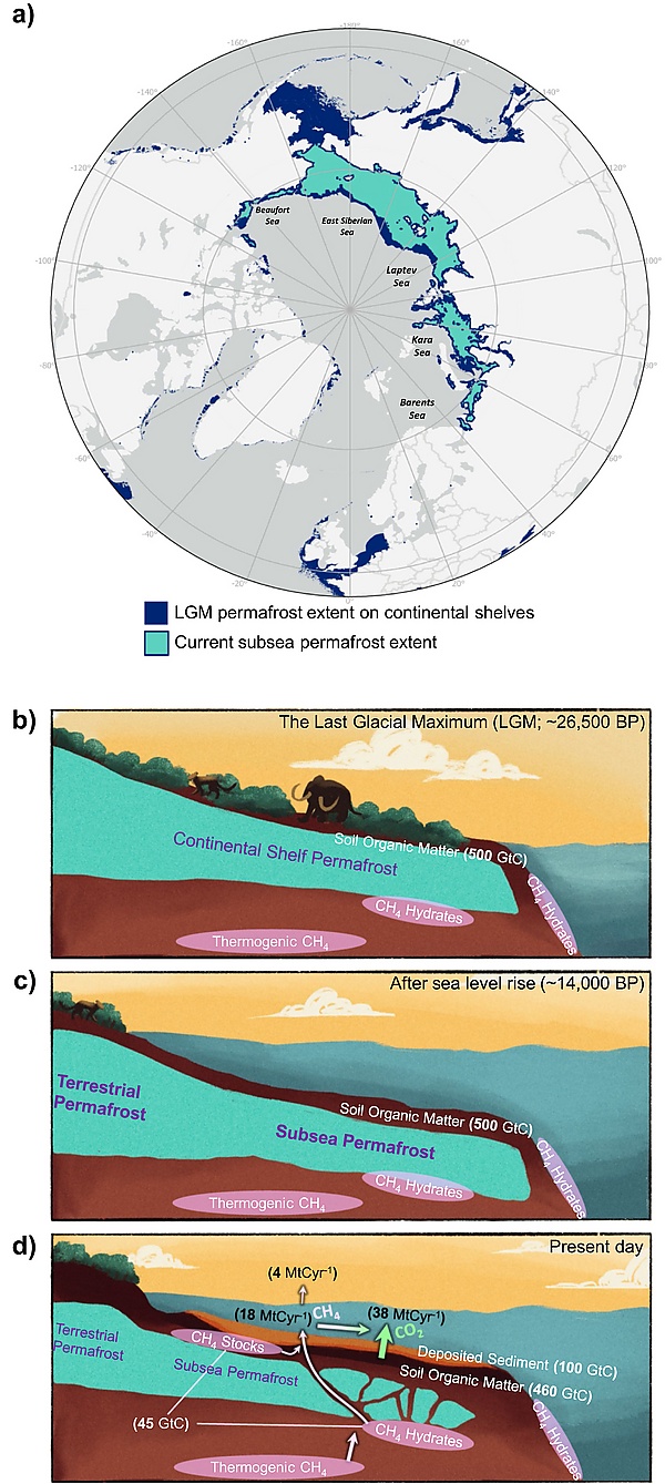 Эксперты оценивают, что подводная область вечной мерзлоты содержит около 560 гигатонн углерода в органическом веществе и 45 гигатонн углерода в форме метана. По прогнозам, до 2100 года при потеплении на 3–12,6 °C относительно доиндустриального уровня может быть высвобождено до 100 гигатонн метана. Если потепление останется в пределах 2 °C, выбросы могут быть примерно на 30 % ниже[34].