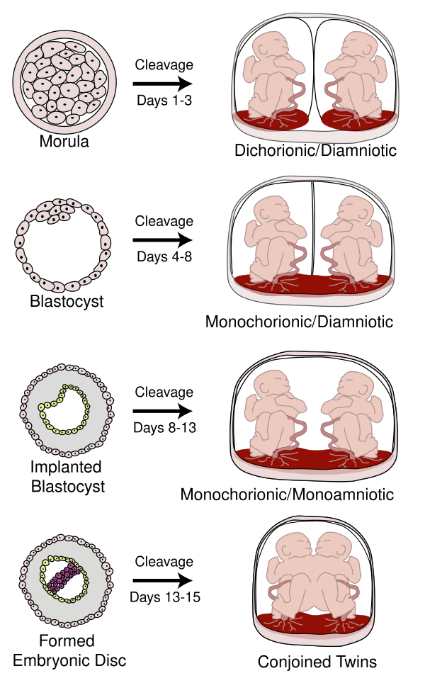 Время разделения зиготы при однояйцевой беременности имеет важное значение: чем раньше оно произошло, тем более обособлены близнецы друг от друга. Например, если разделение произошло с первого по третий день существования зиготы, то каждый близнец окружен двумя плодными оболочками и имеет отдельную плаценту. При более позднем разделении близнецы имеют общую плаценту, только амниотическую оболочку в перегородке (если разделение произошло с 4-го по 8-й день) или отсутствие самой перегородки (если оно произошло с 8-го по 13-й день). Если разделение произошло с 13-го по 15-й день, то это приводит к образованию так называемых сиамских близнецов. Определить во время беременности, к какому типу она принадлежит, возможно далеко не во всех случаях. Только отсутствие перегородки между близнецами позволяет точно отнести беременность к однояйцевой.