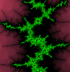 Отсюда понятно, что интересные варианты множества Жюлиа соответствуют точкам, лежащим на границе множества Мандельброта. Точки глубоко внутри образуют простые геометрические фигуры, а внешние выглядят как пыль, окружающая цветные пятна. Некоторые программы, например, Fractint, позволяют пользователю прямо на экране указать точку, для которой необходимо построить соответствующее множество Жюлиа, упрощая поиск красивых изображений.
