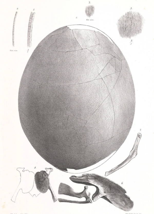 Дифенбах[79] также упоминает окаменелость из района горы Хикуранги и предполагает, что она принадлежит «птице, ныне вымершей, называемой моа (или муви) туземцами». 'Муви' — первая транскрипция названия птицы[80][81]. В 1839 году Джон У. Харрис, торговец льном из Поверти-Бей, увлекавшийся естественной историей, получил от маори кусок необычной кости, найденной на берегу реки. Он показал 15-сантиметровый фрагмент своему дяде, хирургу из Сиднея Джону Рулю, который отправил его Ричарду Оуэну, работавшему тогда в Хантерианском музее Королевского колледжа хирургов в Лондоне[67].