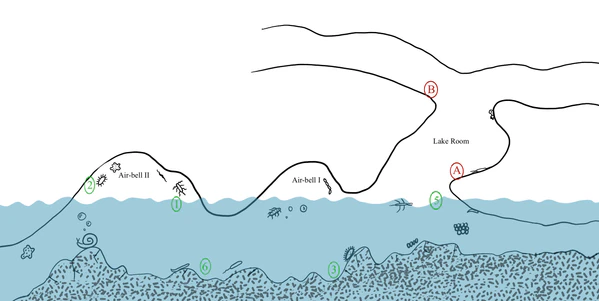Поверхностные воды и большая часть стен пещеры покрыты бактериальными биоплёнками различного размера: от небольших белых плавающих пятен в «озёрной комнате» и «воздушном колоколе I» до жёлтых биоплёнок толщиной до 2 см, обнаруженных в «воздушном колоколе II»[21].
