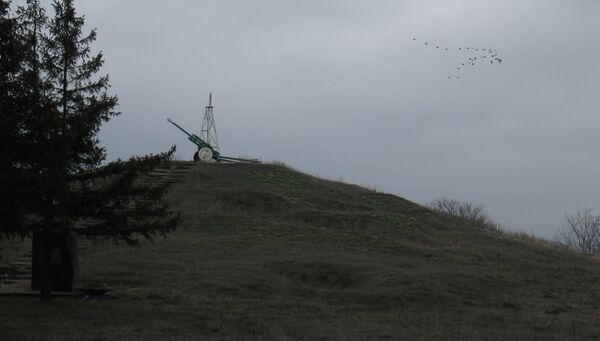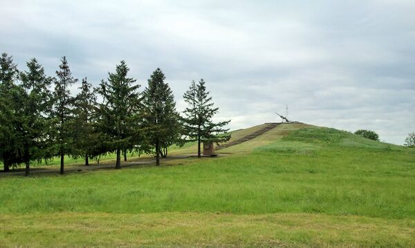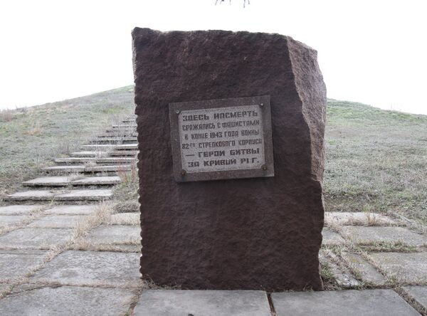 Надпись на каменной плите у основания кургана: «Здесь насмерть сражались с фашистами в конце 1943 года воины 82-го Стрелкового корпуса — герои битвы за Кривой Рог».