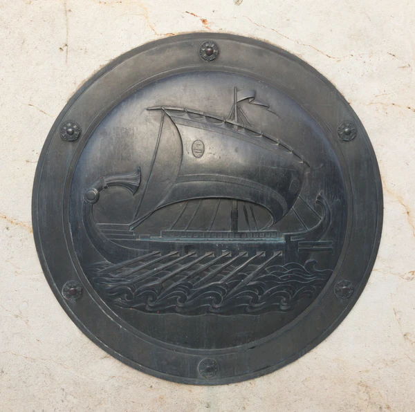С обеих сторон фигуры гоплита начертаны строки из «Истории» Фукидида.