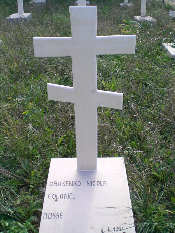 Обосенко (Обозенко, Обозненко) Николай Евграфович — полковник, родился в 1866 г. В службе с 1887 г., офицером с 1890 г., есаул (1902—1903). Воевал в Вооруженных силах Юга России (ВСЮР) и Русской армии до эвакуации Крыма. Был ранен и эвакуирован в Бизерту на госпитальном судне «Цесаревич Георгий». Умер около 6 января 1921 г. на пути из Константинополя в Бизерту[1]. На надгробной плите сохранилась следующая надпись: Obosenko Nicola Colonel Russe 6.1.1921.