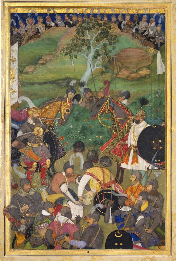 В связи с внезапной смертью отца, Акбар был посажен на могольский трон в 14 лет. Он с детства проявлял интерес к каллиграфии и живописи, а его наставниками в этих искусствах были Мир Сеид Али и Абд ас-Самад, к которым он испытывал уважение всю свою жизнь. Правление Акбара было столь благодатным, что, в конце концов, приняло в Индии легендарный вид. В его царствование границы Могольской империи постоянно расширялись. Его выдающиеся таланты, необычайную любознательность и цепкую память современные исследователи объясняют тем, что Акбар, вероятно, страдал редкой болезнью — дислексией (неспособность к чтению). Именно поэтому он не читал книги, а отмечал своей рукой, до какого места чтецам надлежит произносить текст. Возможно этим же объясняется и его сильное пристрастие к книжным иллюстрациям, позволяющим иметь перед глазами визуальный аналог текста.