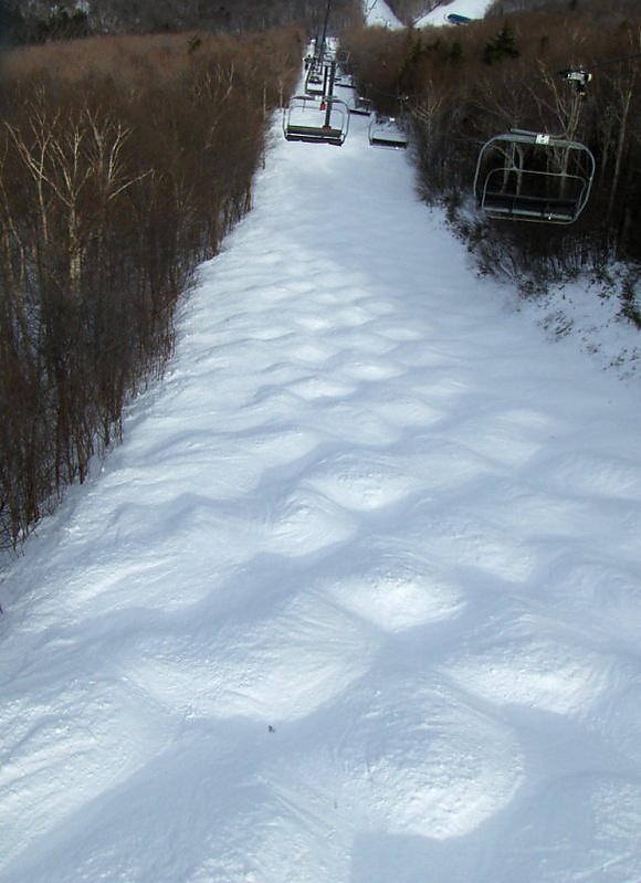 Забавным фактом является то, что на протяжении сезона поля бугров движутся вверх (если их не скапывать), в связи с тем, что нижние части бугров соскребаются лыжниками, тормозящими на них, и этот снег скатывается вниз на следующий бугор.