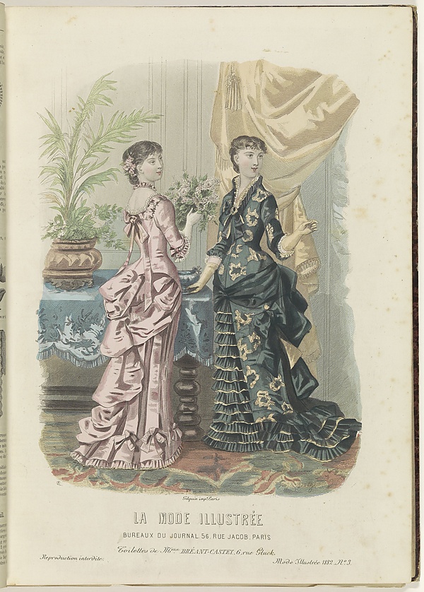 - Платье для визитов 1885-го года с крупным турнюром. Платье надевается поверх нижней юбки того же цвета и драпируется по бокам. Los Angeles County Museum of Art, M.2007.211.34a-b.