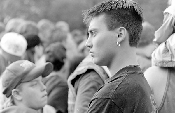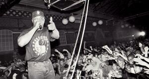 Шведские хип-хоп фанаты на концерте Public Enemy, 1991 год - Распространёнными причёсками, преимущественно унисекс, были остроконечные волосы ярких цветов, натуральные дреды, короткие причёски и синтетические шиньоны. Многие рейверы носили татуировки и пирсинг. Широко распространёнными аксессуарами были браслеты и ошейники, свистки, детские пустышки, боа из перьев, очки в стиле киберпанк, светящиеся палочки и брезентовые сумки для пластинок и дисков[84][85].