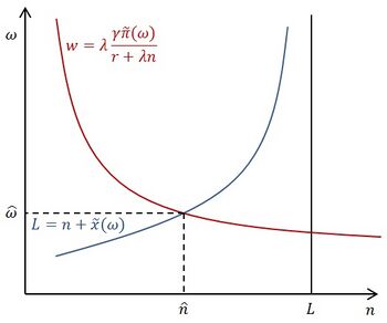 Равновесие на рынке труда в модели представлено на графике. По оси абсцисс отложена занятость в секторе НИОКР , а по оси ординат — эффективная заработная плата . Красная кривая отражает совокупность точек, в которых выполняется арбитражное равновесие в заработной плате между производственным и научно-исследовательским сектором. Синяя кривая отражает равновесные состояния на рынке труда. Поскольку красная кривая наклонена отрицательно, а синяя — положительно, то существует единственное равновесное состояние. Равновесный уровень занятости в секторе НИОКР , от которого зависят темпы роста в модели, растёт при снижении процентной ставки и при росте величины инновации , производительности труда в секторе НИОКР и трудовых ресурсов [23][15].