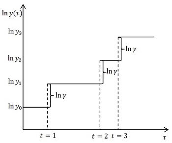 Рост логарифма объёма выпуска с возникновением инноваций представлен на графике. По оси абсцисс отложено время , по оси ординат — натуральный логарифм выпуска . Рост имеет стохастическую природу, поскольку инновации возникают с некоторой вероятностью. При возникновении инновации логарифм выпуска скачкообразно растёт на величину [25].