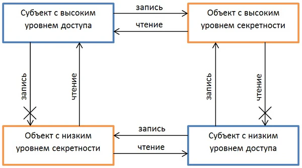 - Запрет записи вниз. В модели невозможна запись из объектов с более высоким уровнем конфиденциальности в объекты с более низким уровнем. Например, нельзя скопировать сообщение «совершенно секретно» в объект класса «секретно», хотя это иногда бывает необходимо[4].