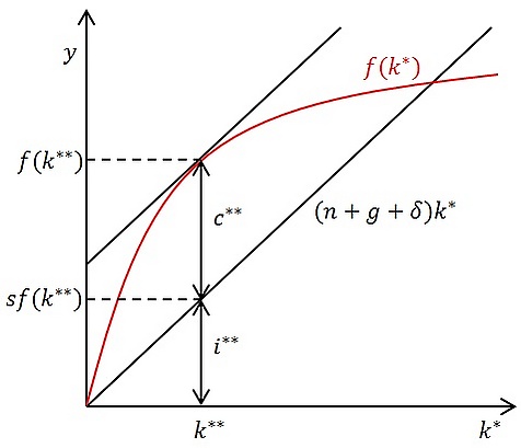 После нахождения устойчивого уровня следующей задачей является нахождение такого значения нормы сбережений , при котором в устойчивом состоянии потребление на единицу эффективного труда максимально. То есть, необходимо решить задачу[20][21]: