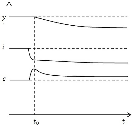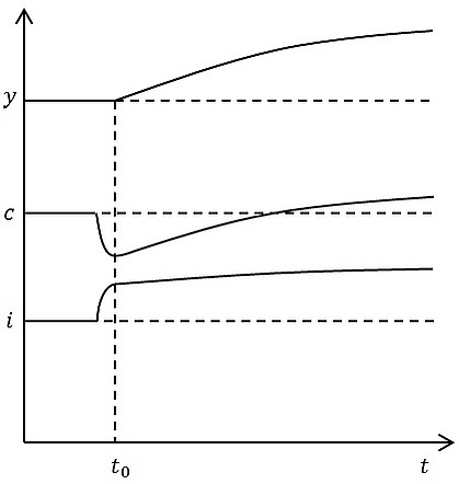 При росте нормы сбережений инвестиции превышают выбытие капитала, растет до достижения равновесия при более высоком уровне . В процессе перехода к новому стационарному состоянию темп роста производительности труда будет опережать темп технического прогресса и при достижении нового равновесия они сравняются. Переход к новому стационарному состоянию при изменении нормы сбережений показан графически на иллюстрации.