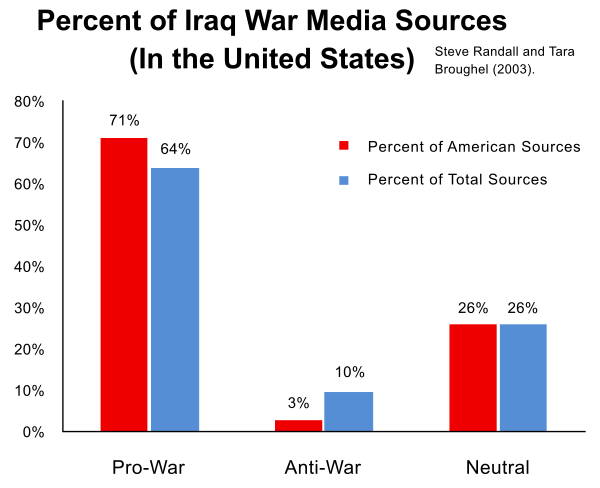 - Вторжение в Ирак (2003), отказ сообщать в СМИ о законности войны, несмотря на подавляющее общественное мнение в пользу того, что вторжение в Ирак могло произойти только с санкции ООН[13][14].