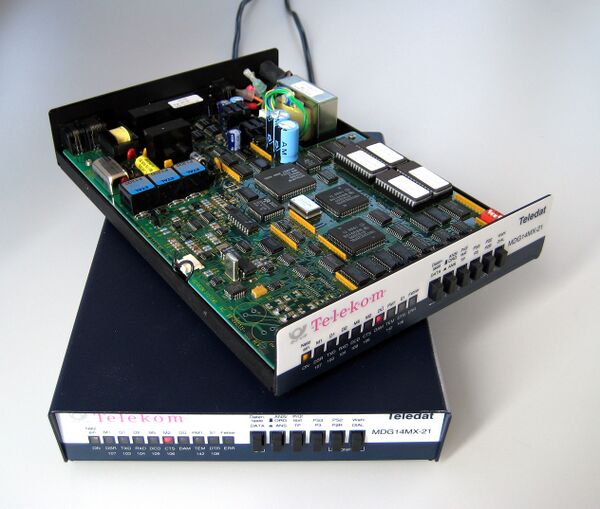 Моде́м (акроним, составленный из слов модулятор и демодулятор) — устройство, применяющееся в системах связи для физического сопряжения информационного сигнала со средой его распространения, где он не может существовать без адаптации. Модулятор в модеме осуществляет модуляцию (что является основным отличием модема от роутера — тот модуляции и демодуляции не осуществляет, если не имеет встроенного модема[1] несущего сигнала при передаче данных), то есть изменяет его характеристики в соответствии с изменениями входного информационного сигнала, демодулятор осуществляет обратный процесс при приёме данных из канала связи. Модем выполняет функцию оконечного оборудования линии связи. Само формирование данных для передачи и обработки принимаемых данных осуществляет т. н. терминальное оборудование (в его роли может выступать и персональный компьютер).