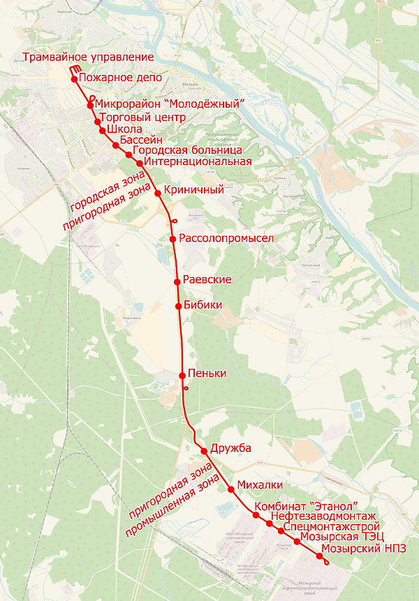 | П | Трамвайное управление | посёлок Пеньки | отдельные рейсы | 12,2 км | |