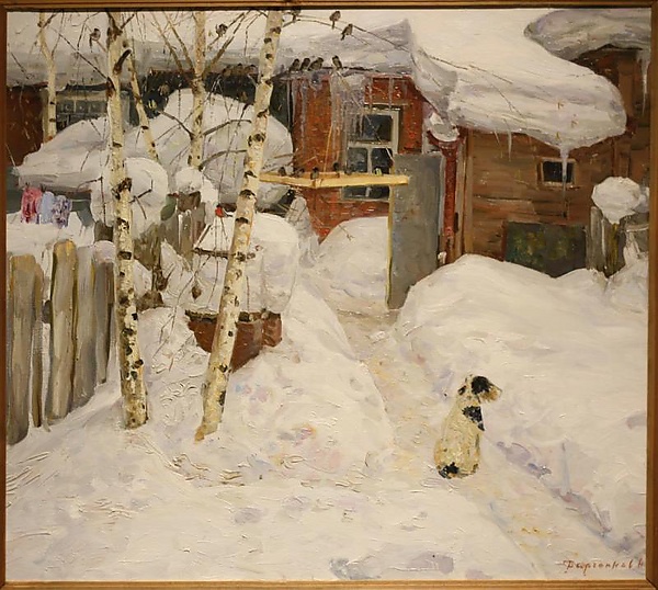 На полотне представлен зимний пейзаж, изображающий внутренний замкнутый двор. На переднем плане находятся стволы берёз, к одной из которых прикреплена кормушка с птицами, а рядом на снегу сидит собака. На заднем плане виден частично занесённый снегом дом с открытой дверью. В работе преобладают тёплые серо-коричневые оттенки в цветовой гамме.