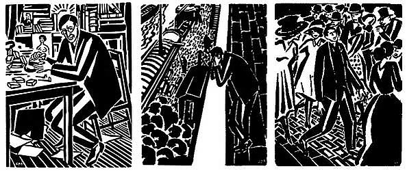 Мазерель использует как графическую технику, так и моральные элементы немецкого экспрессионизма в кино и театре[15]. Так, многие его персонажи выражают свои эмоции простыми, непреувеличенными жестами, что создаёт контраст с более сильными эмоциями других персонажей[16].