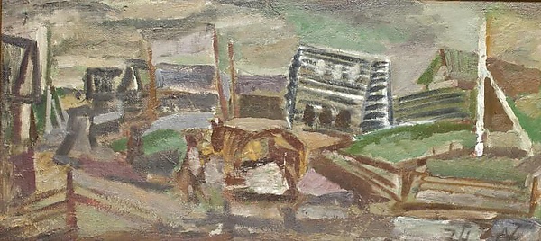 На полотне представлен летний пейзаж с дорогой на переднем плане. Центральную часть занимает группа силуэтов деревенских домов с двухскатными крышами, выделяющихся на фоне холодного серого неба. Полоса неба завершает композицию, подчёркивая спокойствие и простоту сельского пейзажа.