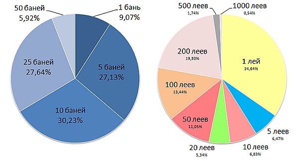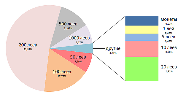 | 100 леев | 33 650 000 | 13,44 % | 3 365 000 000 | 17,73 % |