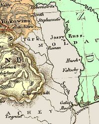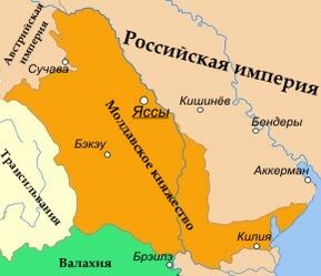 В те же годы на севере княжества развилось народное движение[56], основной целью которого была борьба против крепостничества и крупных землевладельцев. Хоть оно существовало ещё с XVI века, но к концу XVII — середине XVIII приобрело большую значимость. Повстанцы организовывали небольшие отряды, которые совершали налёты на крупные поместья. Гористый рельеф и близость соседних стран позволяли повстанцам удачно маневрировать и скрываться от наказания. Неоднократно между Россией и Турцией происходили войны, и княжество оказывалось ареной военных действий, из-за чего пришло в упадок и разорение. В XVIII веке в княжестве росло влияние России, и наоборот — турецкое влияние ослабевало. С подписанием Кючук-Кайнарджийского мирного договора в 1774 году Российская империя приобрела право покровительствовать православному населению обоих дунайских княжеств — как Молдавского, так и Валахии. В том же году северная часть княжества была аннексирована империей Габсбургов. На приобретённых землях австрийское правительство образовало герцогство Буковина. В 1779 году по Айналы-Кавакской конвенции было разрешено открыть русское консульство в Молдавии (резиденция находилась в Бухаресте), что позволило усилить влияние в Молдавии, в 1783 и 1786 годах в княжестве открылись австрийское и прусское консульства. В 1806 году против Турции началась очередная война, на этот раз она длилась шесть лет. Успехи русских войск вынудили османского султана подписать Бухарестский мирный договор, по которому Российская империя аннексировала всё левобережье реки Прут. Таким образом, в состав Российской империи вошла восточная часть Молдавского княжества и Бессарабия. Эти территории были объединены, получив название сначала Бессарабская область, а затем Бессарабская губерния. После вхождения восточной части Молдавского княжества в состав Российской империи в ней продолжал развиваться молдавский язык на кириллице, в то время как в западной части княжества, вошедшей в состав Румынии, произошла «чистка» языка от славянизмов и в 1862 году язык был переведён на латинскую графику[57].