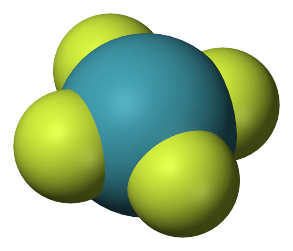 - Ось вращения-отражения: ось, вокруг которой вращение на угол с последующим отражением относительно плоскости, перпендикулярной этой оси, оставляет молекулу неизменной. Называется также несобственной n-кратной осью вращения и обозначается как . Примеры представлены в тетраэдральном тетрафториде кремния с тремя осями и заторможенной конформацией[2] этана с одной осью . Ось соответствует плоскости отражения , а есть центральная инверсия i. Молекула, не имеющая осей для любого значения n является хиральной молекулой.
