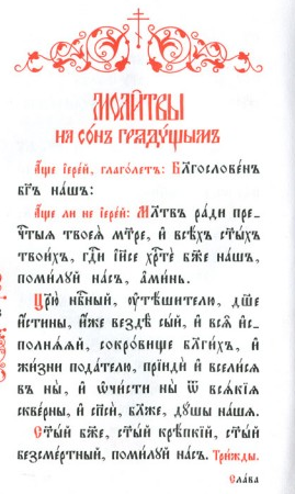 - При отходе ко сну произносится: В ру́це Твои́, Го́споди Иису́се Христе́, Бо́же мой, предаю́ дух мой: Ты же мя благослови́, Ты мя поми́луй и живо́т ве́чный да́руй ми. Ами́нь.