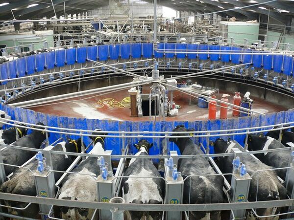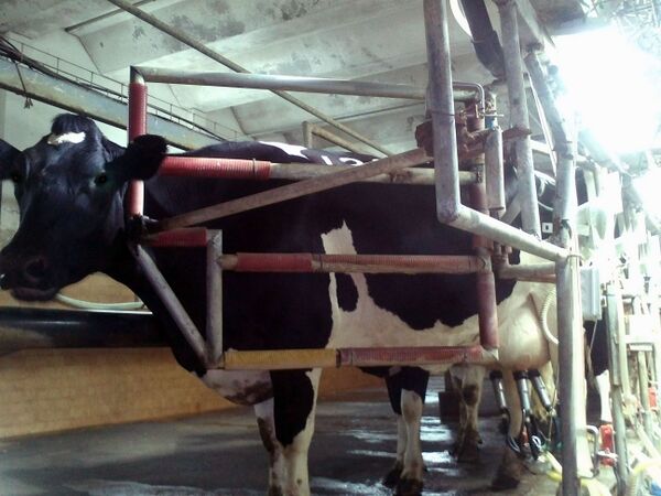Наиболее эффективная с точки зрения трудозатрат и качества молока организация процесса доения предусматривает построение специализированных доильных залов с подачей молока в централизованный молокопровод. Существует несколько типов доильных установок для доильных залов; в установках типа «тандем», «ёлочка», «параллель» коровы доятся в индивидуальных станках, расположенных по обе стороны траншеи, в которых работает оператор и устанавливает доильные аппараты, в первой системе станки расположены параллельно траншее, во второй — под углом 30° или 60°, в третьей — перпендикулярно траншее (используется поворотная калитка, разворачивающая животных выменем к оператору). В крупных хозяйствах широко используются карусельные доильные системы, в которых животные размещаются на круглой вращающейся платформе, оператор, в зависимости от конструкции, может находиться во внутреннем радиусе или снаружи платформы. Карусельная система изобретена в США в 1930-е годы, но распространение в Западной Европе, Австралии и Новой Зеландии получила лишь с 1960-х годов[22], в начале 1980-х годов карусельная система появилась и в СССР — была установлена на одном из крупнейших в мире молочных хозяйств того времени «Щапово»[23].