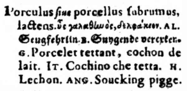 Первое зафиксированное использование термина в английском языке датируется 1553 годом: «Yonge suckynge pygges, лат. porci delici»[11]. The Oxford Companion to Food (OCF) комментирует: «Молочных поросят (sucking pigs) иногда называют suckling pigs; это неверно, так как suckle (кормить грудью) делает мать, а детёныш — suck (сосёт)»[11]. В XVI веке распространённым альтернативным термином был «жареный поросёнок» (roasting pigs). Молочные поросята широко использовались в средневековой кулинарии; когда свиней стали чаще разводить на фермах, чем охотиться на них в лесах, большую часть приплода стали забивать и продавать как молочных поросят[11]. В XVIII веке Ханна Гласс, а в XIX веке миссис Битон публиковали рецепты их приготовления, называя это «всегда самым предпочтительным способом их готовки»[11]. Миссис Битон оговаривала: «Молочный поросёнок, чтобы быть съеденным в совершенстве, должен быть не старше трёх недель и должен быть разделан в тот же день, когда был убит»[5]. OCF добавляет, что «в последнее время молочный поросёнок становится всё менее обычным блюдом в Англии и США»[11].
