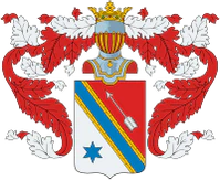 Описание герба: Выдержка из Общего гербовника В щите разделённом на два равных поля, первое красное, а второе серебряное, изображена с правого верхнего к нижнему левому река с золотыми берегами. В верхней части серебряная стрела, летящая вправо, а в нижней части шестиконечная голубая звезда. Щит увенчан обыкновенным дворянским шлемом и дворянской на нём короной. Намёт на щите красный, подложенный серебром. |