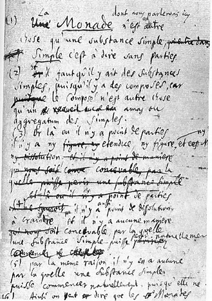 Согласно Лейбницу, основаниями существующих явлений, или феноменов, служат простые субстанции, или монады (от греч. monados — единица)[5]. Все монады просты и не содержат частей[6]. Их бесконечно много[7]. Монады обладают качествами, которые отличают одну монаду от другой, двух абсолютно тождественных монад не существует[8]. Это обеспечивает бесконечное разнообразие мира феноменов. Идею, согласно которой в мире не существует абсолютно схожих монад или двух совершенно одинаковых вещей, Лейбниц сформулировал как принцип «всеобщего различия» и в то же время как тождество «неразличимых», выдвинув тем самым глубоко диалектическую идею[9]. Согласно Лейбницу, монады, саморазвёртывающие всё своё содержание благодаря самосознанию, являются самостоятельными и самодеятельными силами, которые приводят все материальные вещи в состояние движения[9]. По Лейбницу, монады образуют умопостигаемый мир, производным от которого выступает мир феноменальный (физический космос)[7].