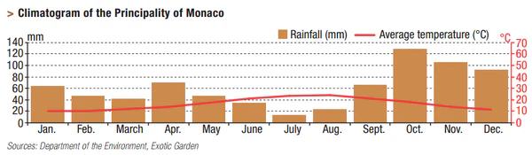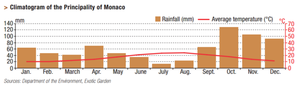 Климат Монако субтропический средиземноморский[20], с тёплым сухим летом (средние температуры 20—25 °С) и мягкой дождливой зимой (средние температуры 10—12 °С). Подавляющее количество осадков выпадает осенью и зимой, солнечных дней в году — около 300, дождливых — около 60. Климат Монако аналогичен южному побережью Франции.