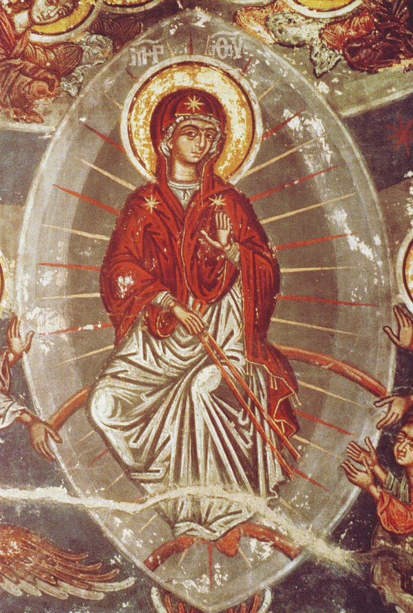 На западной стене нефа представлены сцены жизни Богоматери: Рождение, Рождество и Успение[1]. Ниже двое архангелов и двое творцов, мученичество святого Георгия. Среди фигур нижнего пояса сей сохранилась лишь фигура святого Константина.