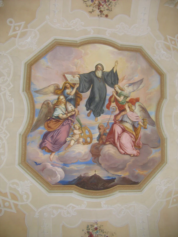 Этот мотив церкви воинствующей и побеждающей продолжается в аллегориях на великолепных фресках потолка пресвитерия, выполненных Иоганном Михаэлем Роттмайром. Ему же принадлежат потолочные фрески в нефе, созданные им по проектам Бедуччи. Они изображают «Via Triumphalis» св. Бенедикта. Роспись в фонаре купола — маленькой куполообразной надстройке с декоративными аркадами — принадлежит кисти Роттмайра (1716—1717) и изображает Небесный Иерусалим с Богом Отцом, Христом и Святым Духом. Вокруг них — апостолы, Дева Мария и сонм особо значимых для монастыря в Мельке святых.