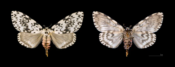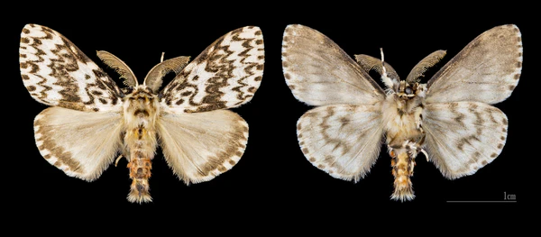 Крылья в размахе достигают 35—55 мм (до 6 см[3]), бабочка в длину 2,3 см[3]. Передние крылья окрашены в белый, с чёрными зубчатыми поперечными линиями, задние — беловато-серые[2], кроме того, в окраске есть пятна на голове, спинке и крыльях[3]. У самки на брюшке есть чёрные и розовые пояски, брюшко заканчивается втяжным яйцекладом; кроме того, у самок чёрные зазубренные усики. Усики самцов — бурые, перистые, брюшко заканчивается пушистой кисточкой[3].