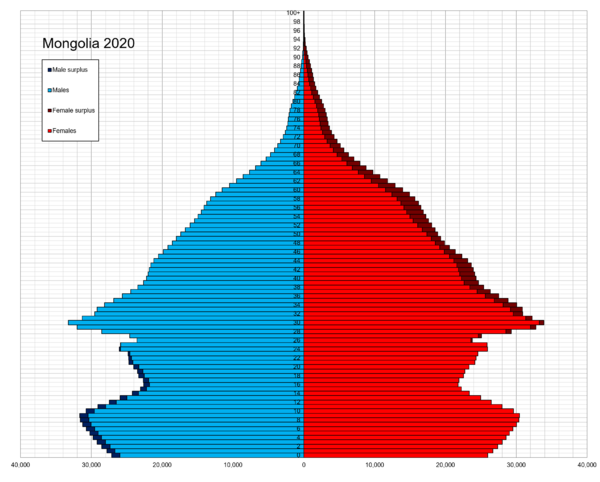 С 1990 года в Монголии происходят социальные перемены и улучшения в здравоохранении. Существует ещё немало возможностей для совершенствования, особенно в малонаселённых районах[69]. Младенческая смертность в Монголии — 4,3 %[70], в то время как средняя продолжительность жизни женщин составляет 70 лет; для мужчин — 65 лет. Общий коэффициент рождаемости в стране (SFT) — 1,87.