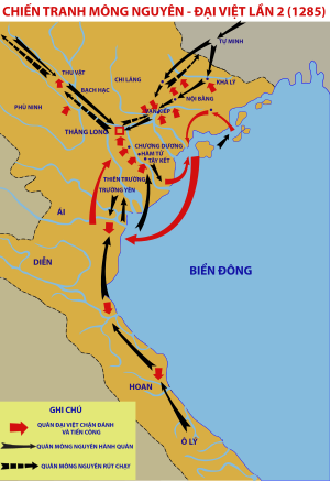 Армия Тугана продвигалась вниз по реке Хонгха, где была встречена дайвьетским войском под командованием Чан Хуан Хая. Последнему удалось победить войско монголов и заставить Тугана повернуть обратно. Второе монгольское войско, бывшее ранее под командованием Согету, было на голову разбито Чан Хынг Дао, который заставил монголов принимать сражения там, где монгольская конница не могла сражаться в полную силу.