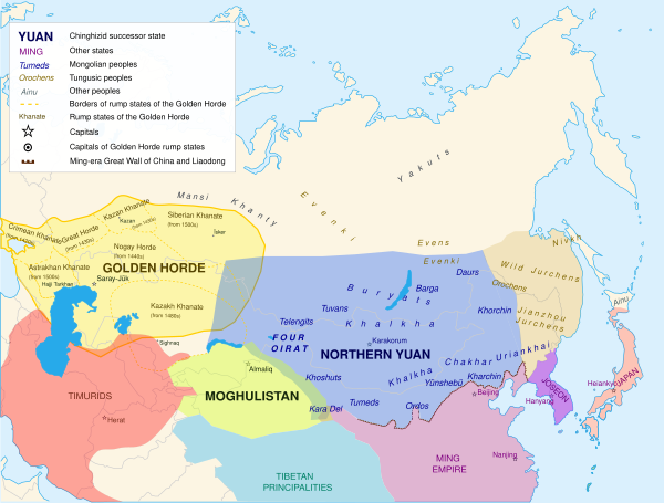 В 1368 году монголы, после междоусобных столкновений монгольской знати, были изгнаны из Китая на север войсками Чжу Юаньчжана, который, захватив Пекин, провозгласил династию Мин.