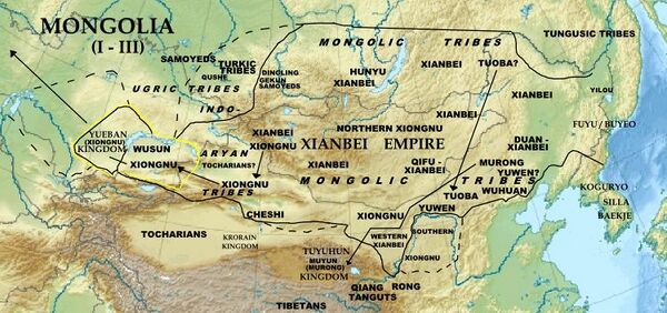 Империю Хунну сменили потомки дунху — сяньби. Племена сяньби, хунну, цзе, ди, цяны объединялись в китайских источниках под общим именем ху. Самые ранние упоминания о дунху относятся к VII веку до н. э., периоду царствования цзиньского правителя Вэнь-гуна[240][241]. Из протомонгольского союза Дунху выделились ухуань, сяньби, татабы (кумоси). Империя Сяньби просуществовала с 93 г. по 234 г. В дальнейшем из сяньби выделились жужани, основавшие Жужаньский каганат (330—555). Потомками жужаней — аварами, откочевавшими в Центральную Европу, был создан Аварский каганат (562—823). Как считает большинство венгерских учёных, потомками аваров являются современные секеи[242][243][244]. Ухуани признаются возможными предками уаров и эфталитов[245].