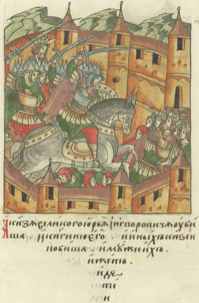Битва под Коломной. Точное время подхода Батыя к Коломне неизвестно. По мнению В. В. Каргалова, это произошло около 10 января 1238 года. Путь по берегу Оки, а затем вдоль Москвы-реки вглубь Владимиро-Суздальского княжества был, фактически, единственным проходимым для больших масс конницы, которая не смогла бы пройти по Мещерской низменности. Коломна, таким образом, являлась важной крепостью, и именно её владимирский князь Юрий Всеволодович назначил местом сбора войска. Его старший сын Всеволод, прибывший в Коломну со всими людьми[41], и воевода Еремей Глебович, привели владимирскую дружину. В город также прибыли остатки рязанских войск во главе с Романом Ингваревичем и новгородские полки[42]. Воевода Еремей с князем Романом возглавили сторожевой полк. Русские вели бой в окружении, однако, известно, что в армии Батыя был убит один из чингизидов, обычно находившихся позади войска, младший сын Чингисхана Кулькан. Это позволяет историкам предположить, что порядок монгольских войск был нарушен в ходе сражения, и русским воинам удалось прорваться в тыл противника[43]. Последние схватки велись у надолб (коломенских защитных сооружений), к которым оказались прижаты русские войска. Воевода Еремей и князь Роман Ингваревич пали в бою, князь Всеволод с малой частью дружины сумел спастись.
