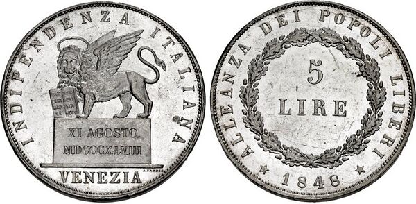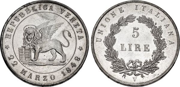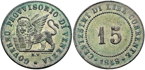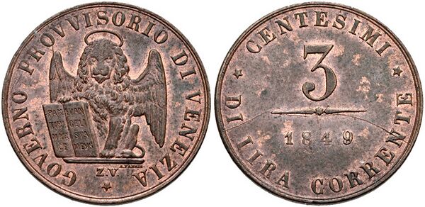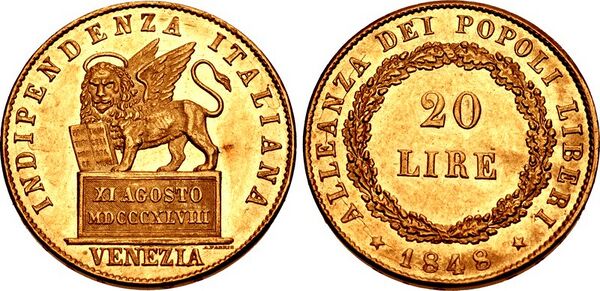 За 1,5 года существования в республике наладили выпуск монет. Была принята десятичная денежная система. 1 венецианская лира соответствовала 100 чентезимо. В 1848—1849 годах отчеканили медные 1, 3 и 5 чентезимо, серебряные 15 и 25 чентезимо, а также два типа монет номиналом в 5 лир. Также небольшим тиражом в 5210 экземпляров по весовым характеристикам наполеондора (6,4516 г золота 900-й пробы) отчеканили 20 лир[84].