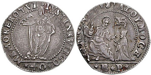 Джустина (итал. giustina) — название нескольких серебряных монет на реверсе которых изображена святая Иустина Падуанская. Впервые три номинала монет (40, 20 и 10 сольдо) с изображением коленопреклонённого перед апостолом Марком дожа на аверсе и святой Иустиной на реверсе были отчеканены в 1472 году во время правления Николо Троно (1471—1473)[59][60]. Джустина номиналом 40 сольдо имела вес в 9,04 г при содержании 8,569 г чистого серебра[61]. По распоряжению дожа Николо да Понте (1578—1585) отчеканили две большие памятные монеты: