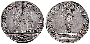 - джустина маджоре (итал. giustina maggiore) — номиналом 160 сольдо или 8 венецианских лир весом 36,38 г при содержании 34,488 г чистого серебра[59][60][61];