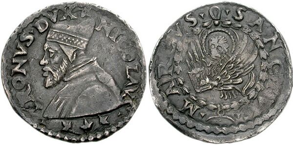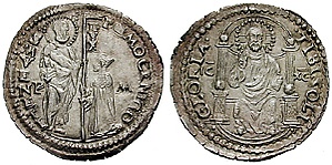 В 1472 году в качестве реальной монеты была впервые отчеканена «лира», которая до этого являлась счётной единицей, равной 20 шиллингам (сольдо). Изображение дожа на монете вызывало аналогии с монархией и недовольство республиканских кругов. После смерти Николо Троно в 1473 году выпуск портретных лиры и багатино был прекращён. При его преемнике Пьетро Мочениго стали чеканить лиры с изображением коленопреклонённого перед апостолом Марком дожа. Данный монетный тип выпускали с 1474 по 1575 год. Он получил название лиры мочениго[46]. Хоть саму лиру Трон чеканили всего два года, она имела существенное значение для денежного обращения Италии, так как стала образцом для подражаний серебряных монет других итальянских государств[47].
