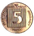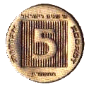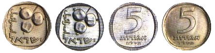 | 5 новых агор | 18,5 | 0,9 | Аверс: Герб Израиля; текст «Израиль» на иврите, арабском и английском языках; Реверс: цифра «5»; текст «новых агор» и год выпуска на иврите. |