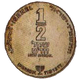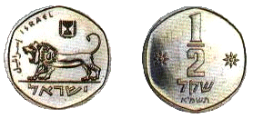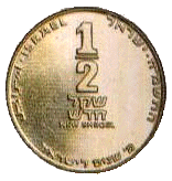 | 1⁄2 шекеля | 20 | 3 | Аверс: рычащий лев; герб Израиля; текст «Израиль» на иврите, арабском и английском языках; Реверс: цифра «1/2»; текст «шекель» и год выпуска на иврите; две декоративные восьмиконечные звезды. |