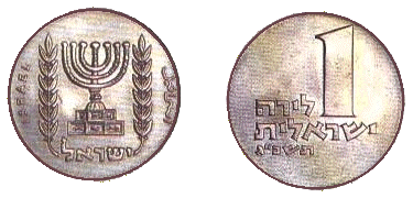 | 1 фунт | 27,5 | 9 | Аверс: Герб Израиля; текст «Израиль» на иврите, арабском и английском языках; Реверс: цифра «1»; текст «израильский фунт» и год выпуска на иврите. |