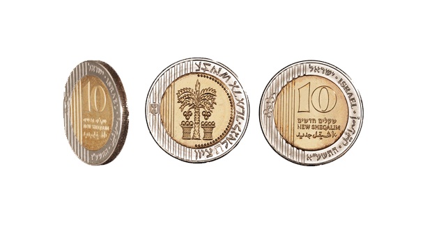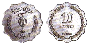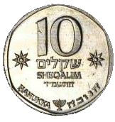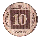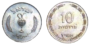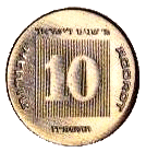 24,5 | 1,6 | Аверс: амфора и две стилизованные пальмовые ветви; текст «Израиль» на иврите и арабском языке; Реверс: цифра «10»; текст «прутот» и дата выпуска на иврите; две стилизованных ветви оливы по кругу. |